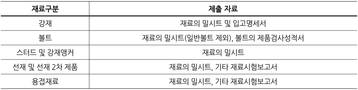 표 2.2-1 재료별 품질확인 제출 자료