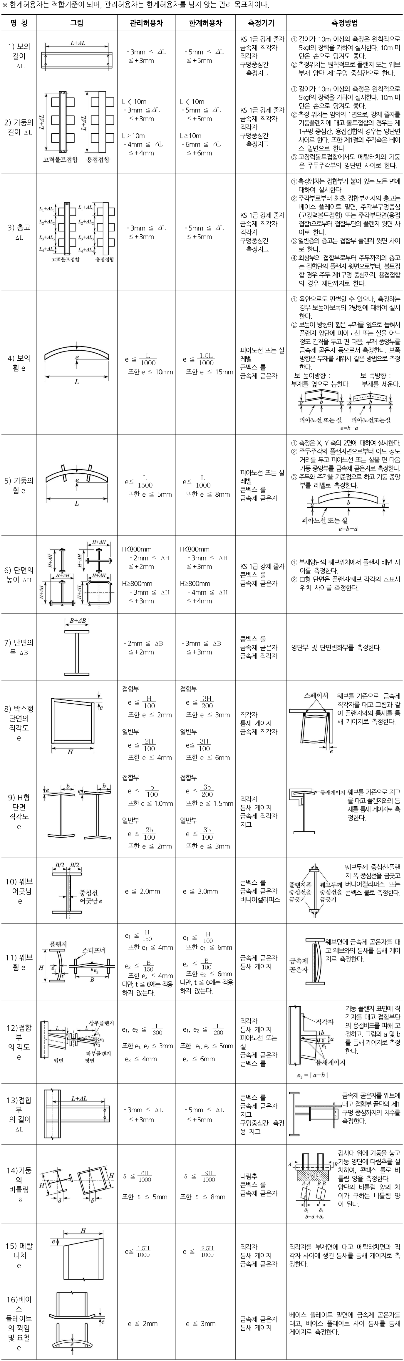 (1) 정밀도 관리기준은 강구조 건축물 및 공작물의 공장제작과 현장시공의 정밀도 관리기준에서 공장제작의 가공 공작 및 조립의 정밀도, 고장력볼트 관련 정밀도, 용접 관련 정밀도, 제품 관련 정밀도, 공사현장 설치공사 정밀도 등을 정한 것이다.