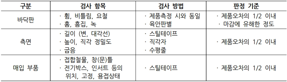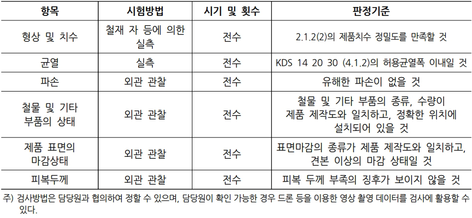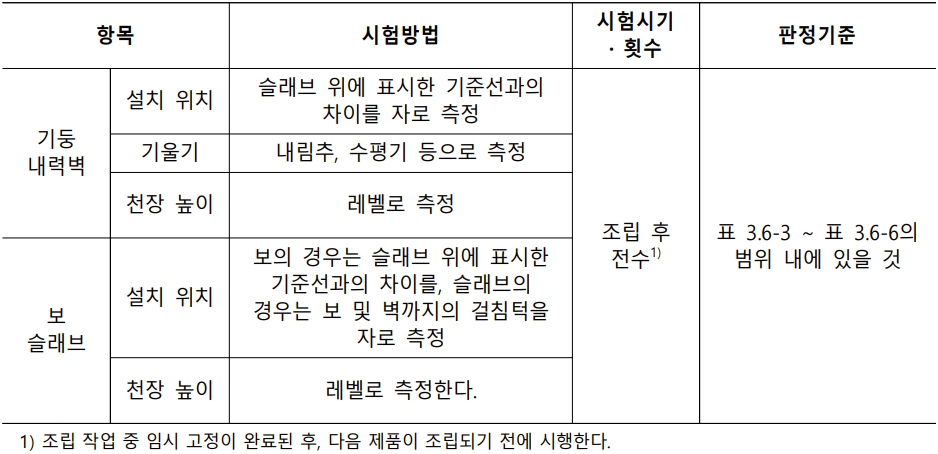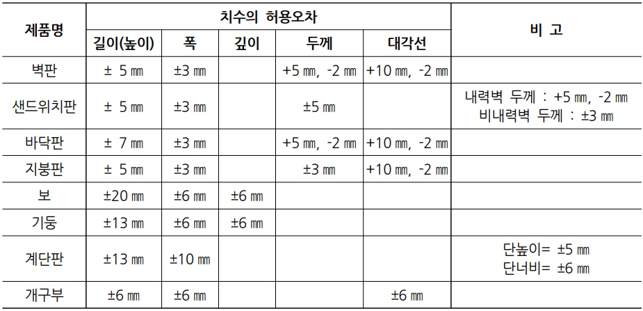 표 3.6-2 프리캐스트 콘크리트 제품의 조립 정밀도 시험 및 검사