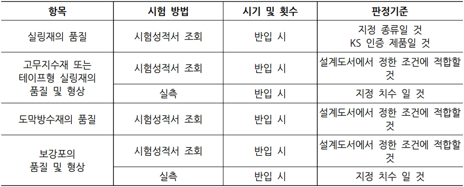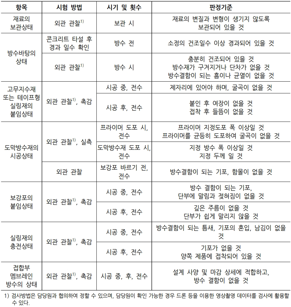표 3.6-14 접합부 방수시공 시의 시험 및 검사