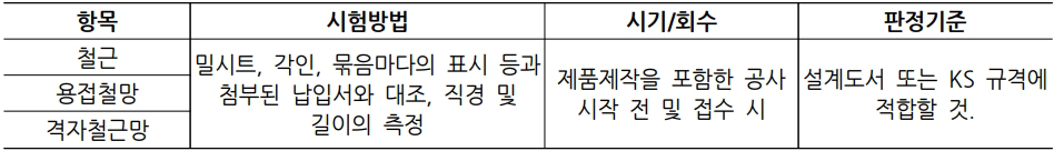 표 3.6-12 철근 이음용 그라우트의 시험 및 검사