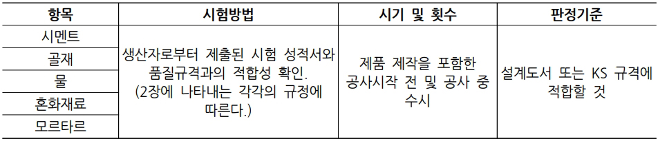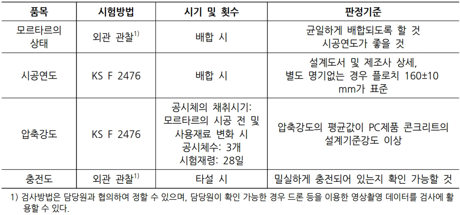 (7) 충전 모르타르의 시험 및 검사는 표 3.6-10에 따른다.