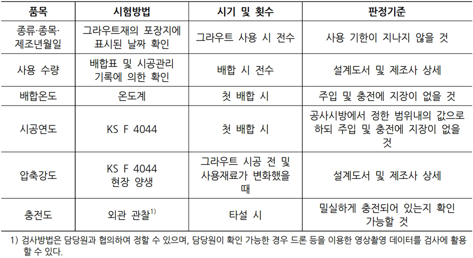 표 3.6-11 줄눈 부위 등 그라우트의 시험 및 검사 항목