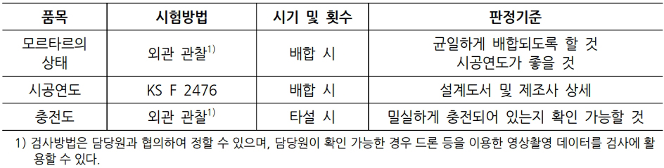 표 3.6-10 충전 모르타르의 시험 및 검사