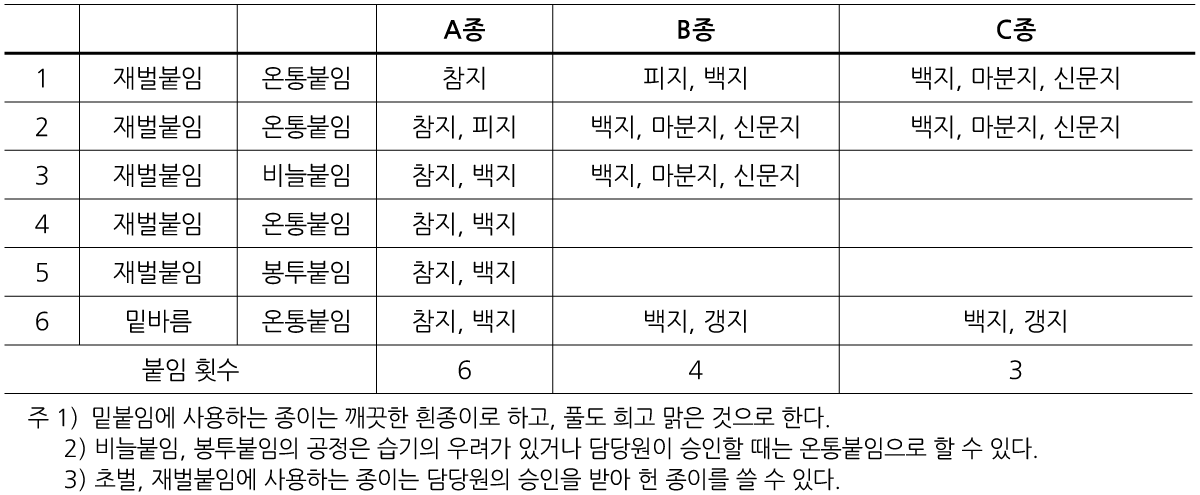 종이, 천류는 아래 바탕에 붙이는 것으로 하며 기타 바탕에서 적용하는 경우에는 공사시방에 따른다.
