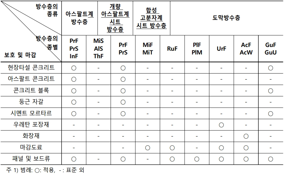 - 보호층: 플라스틱 하드 보드, 섬유 혼합 보호판, 모르타르, 경질형 발포 플라스틱 폼 등의 방수층을 보호하기 위하여 설치하는 층