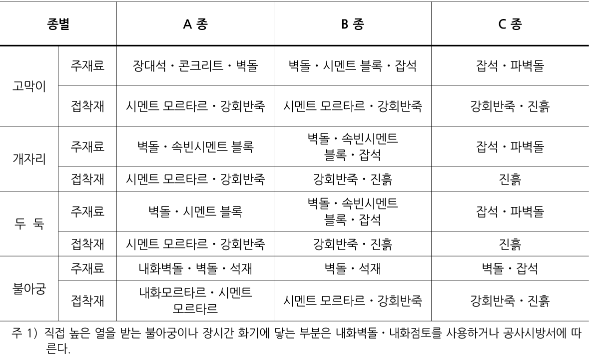 고래켜기에 있어 고막이, 두둑, 개자리 및 불아궁 쌓기의 재료는 표 3.1-1에 따르고 설계도면이나 공사시방서에 정한 바가 없을 때에는 B종으로 한다.
