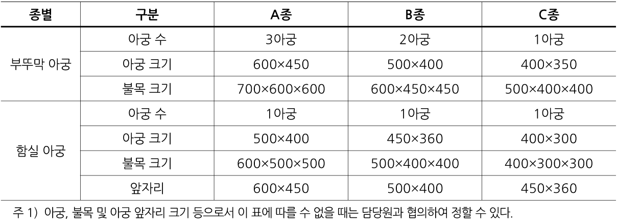 (2) 함실아궁 크기 기타는 표 3.3-1에 따르고, 종별의 지정이 없을 때에는 B종으로한다.