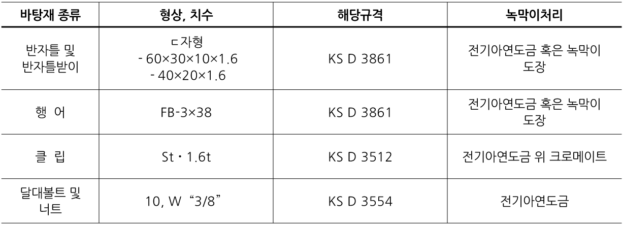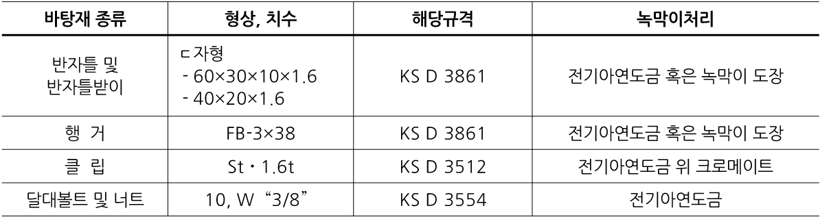 한국산업표준에 적합한 자재를 사용하며 최소 부착량 120g/m²의 아연 도금 또는 이와 동등 이상의 녹방지 처리를 한 제품을 사용한다.