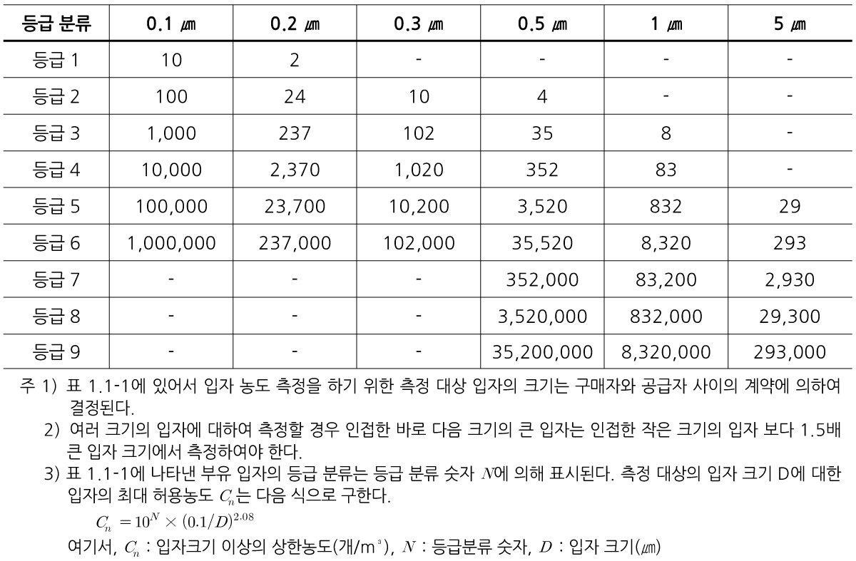 표 1.1-1 클린룸 및 청정 구역의 부유 입자 청정도 등급 (개/m3)