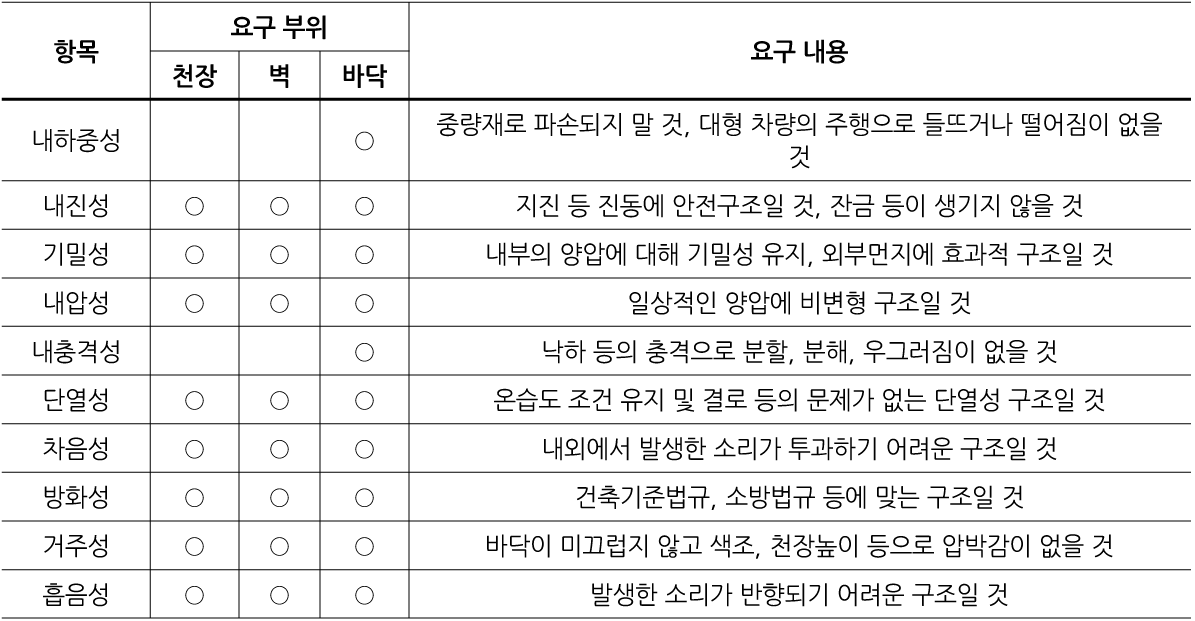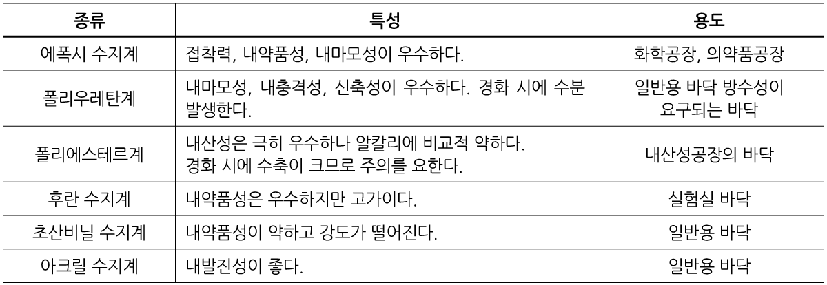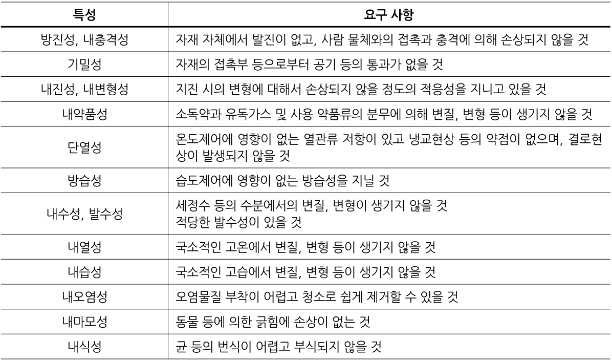 바닥에 사용되는 자재는 표 2.1-1의 요구에 충족되어야 한다.