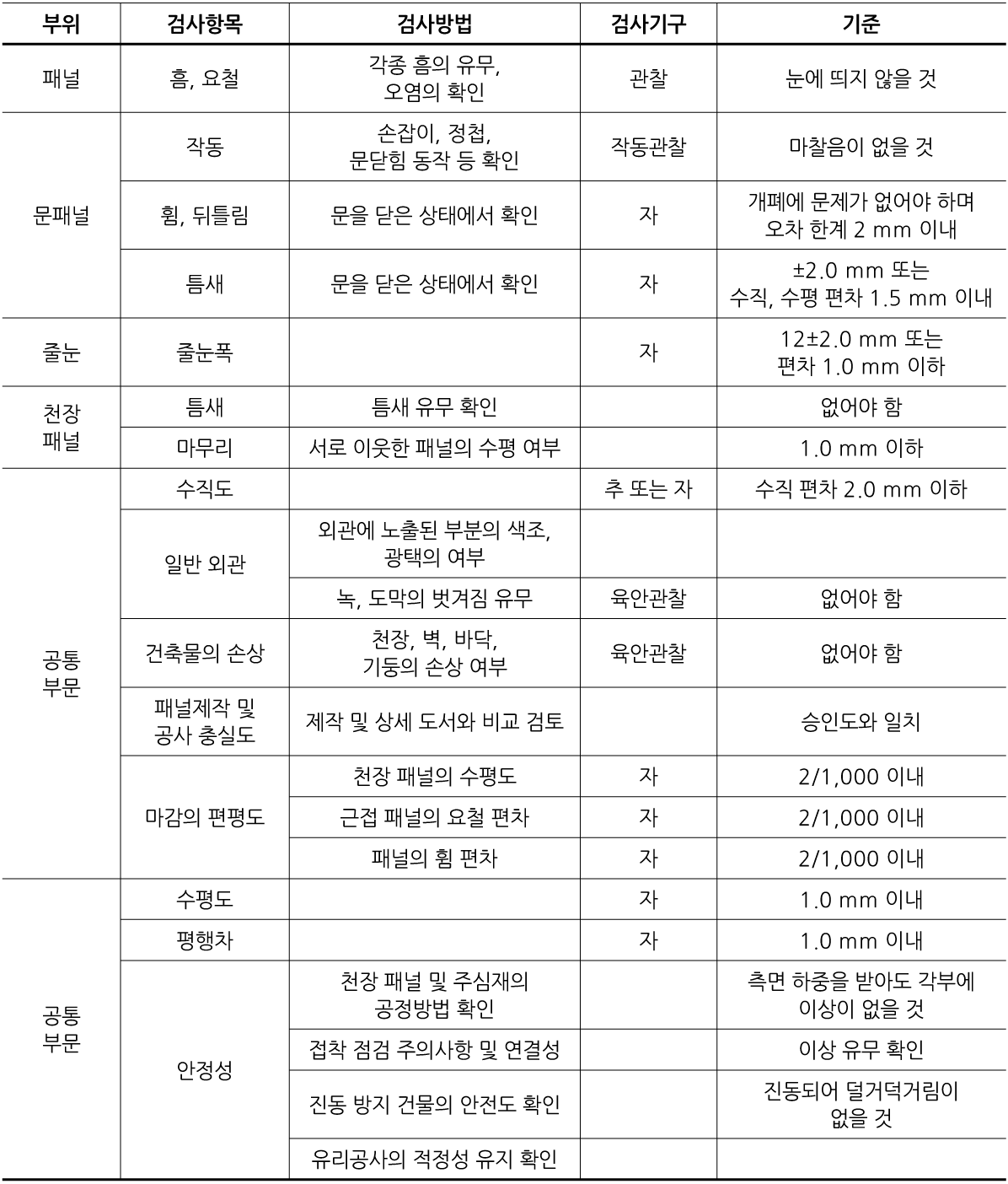 가. 패널의 구조: 클린룸에 적합한 조건의 구비 여부와 보강재, 내부심재의 안정성을 점검하고 연결방법과 강도 등을 점검한다.