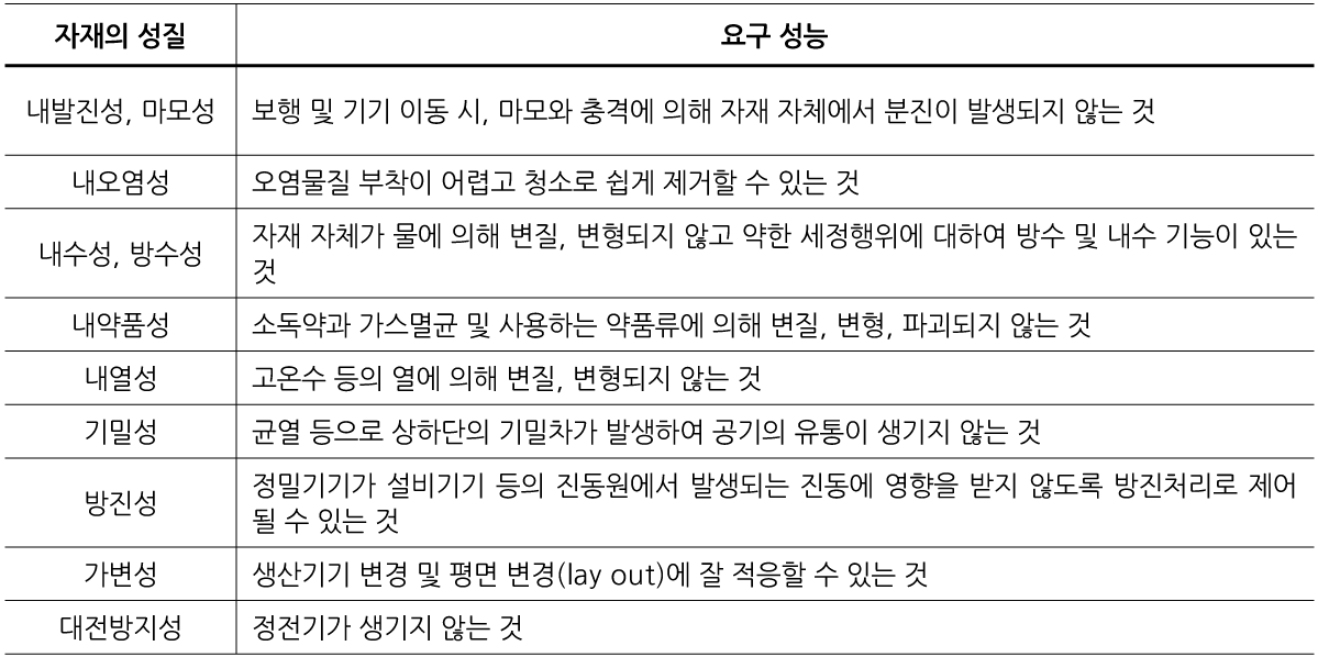 클린룸 벽에 사용되는 벽체의 자재는 표 2.2-1의 요구 성능을 충족하여야 한다.